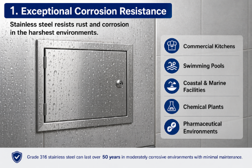 Stainless steel access panels are the superior choice for environments that demand durability, hygiene, and long-term performance. Whether you're outfitting a commercial kitchen, a hospital corridor, a pharmaceutical facility, or an industrial plant, stainless steel consistently outperforms alternatives like plastic, drywall, or standard steel. The core reasons are simple: it resists corrosion, withstands heavy use, meets strict hygiene standards, and delivers a lower total cost of ownership over its lifespan.