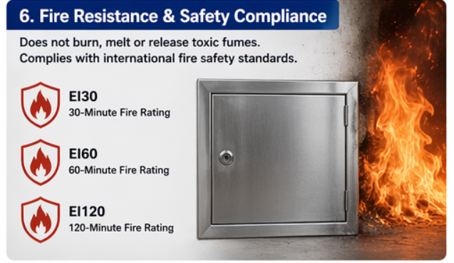 In buildings where fire safety is a regulatory requirement, access panel material choice directly affects compliance. Stainless steel does not ignite, burn, or release toxic fumes when exposed to fire — a critical advantage over plastic panels, which can melt, combust, and emit harmful gases. Stainless steel maintains structural integrity at temperatures up to 870°C (1,600°F) for standard grades, and even higher for specialty grades.