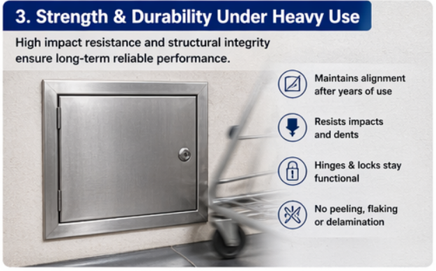 Access panels in high-traffic areas are subject to repeated opening, closing, impacts, and physical stress. Stainless steel panels are significantly more impact-resistant than plastic or standard drywall access panels. Austenitic stainless steel (the most common type used in panels) has a tensile strength of approximately 515–620 MPa, compared to around 150–300 MPa for mild steel and far less for polymer alternatives.