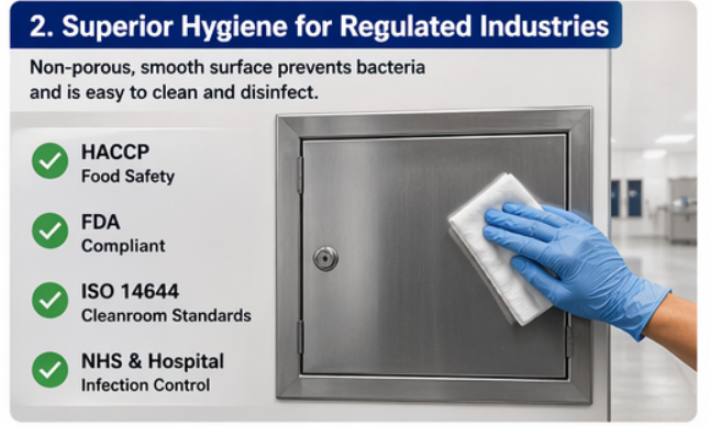 Hygiene is non-negotiable in healthcare, food processing, and pharmaceutical environments. Stainless steel access panels provide a non-porous, smooth surface that prevents bacteria, mold, and contaminants from embedding in the material. Unlike painted steel or plastic panels, stainless steel does not absorb moisture or harbor microbial growth.