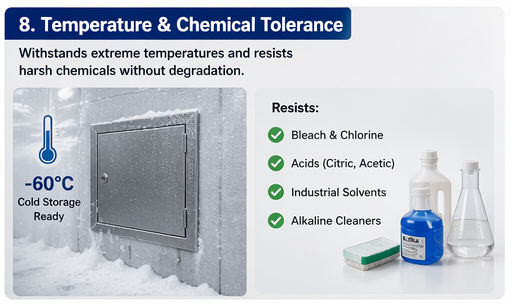 Some installations require access panels that can withstand extreme temperatures or regular contact with aggressive chemicals. Stainless steel excels in both scenarios. In cold storage and freezer rooms, where temperatures can drop to –60°C, stainless steel retains its mechanical properties without becoming brittle — a known failure mode for plastic panels in cryogenic environments.